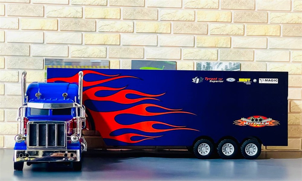 Яркая синяя кабина с хромированными элементами и большой прицеп с огненными наклейками смотрятся очень эффектно. Отличный вариант для коллекции, детских игр или в качестве декоративного элемента.